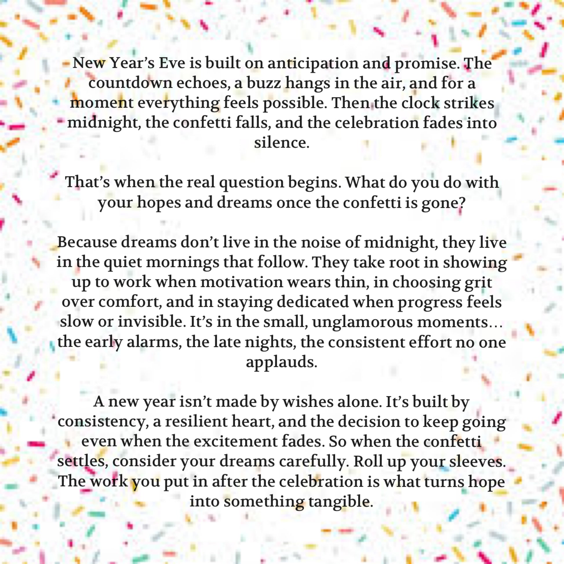 A new year isn’t made by wishes alone. It’s built by consistency, a resilient heart, and the decision to keep going even when the excitement fades. So when the confetti settles, consider your dreams carefully. Roll up your sleeves. The work you put in after the celebration is what turns hope into something tangible.