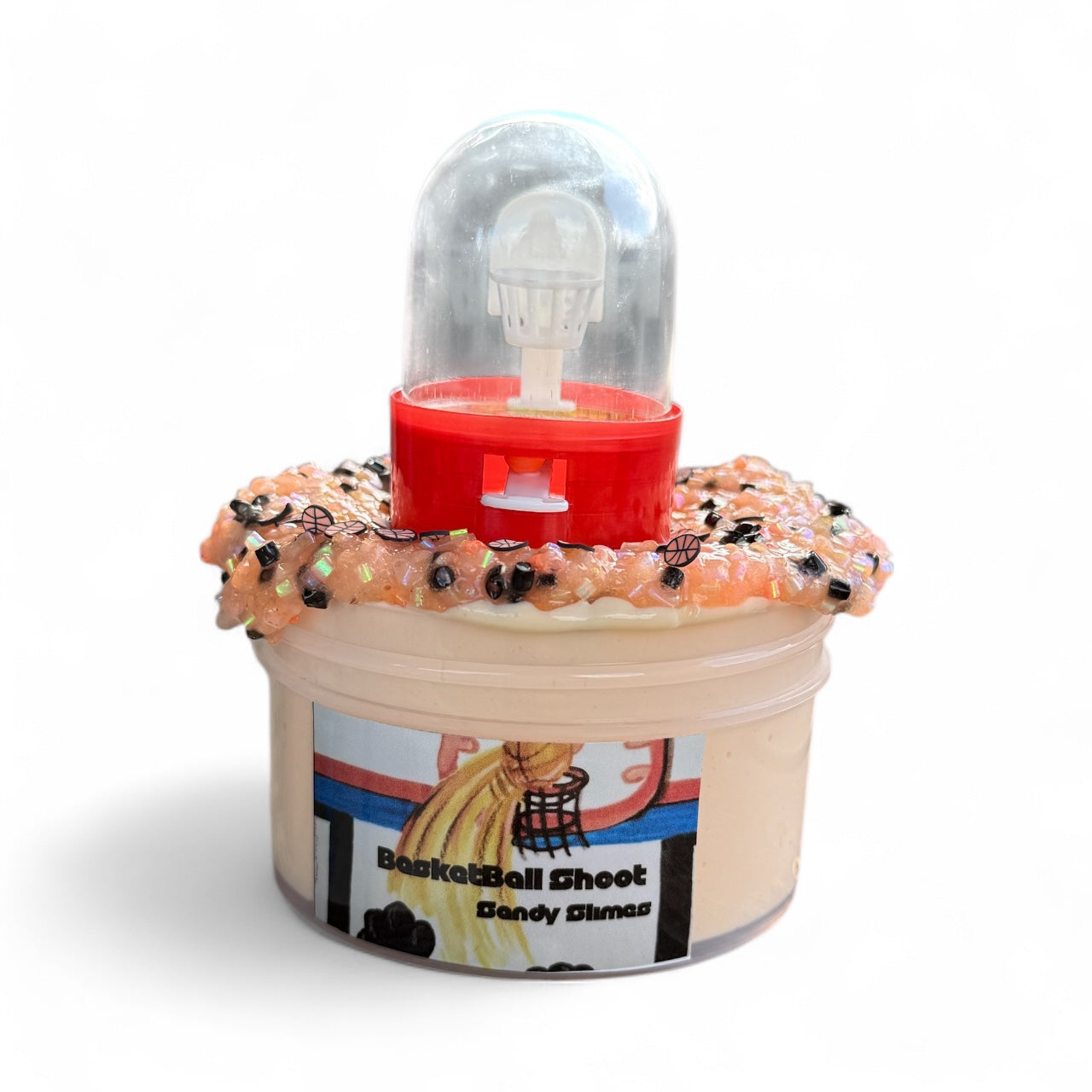 Our thick and glossy had a new improved texture and it’s back in the shop with a crispy bingsu topper. This lightly pigmented orange slime has a metallic orange and black bingsu topper. It’s scented like peach bellini and cool citrus basil. It’s such a refreshing scent combination - fruity and earthy. For the top you’ll get a small amount of basketball fimos and a fun little basketball shoot game as the charm.