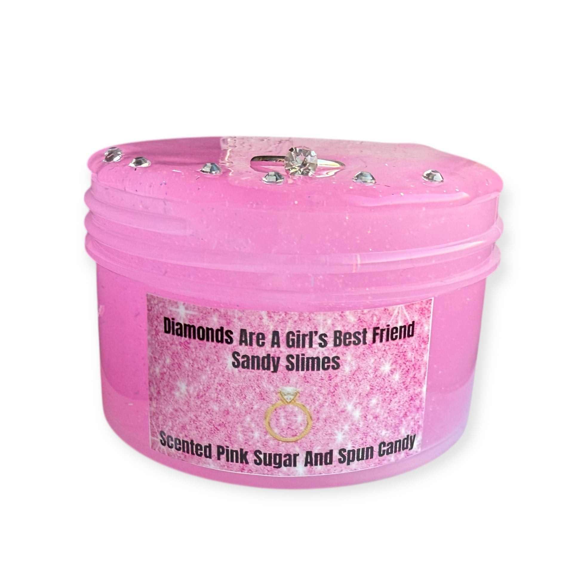 Diamonds are a Girl’s Best Friend is a glitter infused pink coated clear shimmer slime. This slime really comes alive in natural sunlight, catching its gorgeous shimmer at every angle. For the top, you’ll receive a baggie of flatback rhinestones. For the finishing touch, it includes a faux adjustable engagement ring. This slime is perfect for making satisfying bubble pops and ASMR. It is scented pink sugar and spun candy. This isn’t necessarily a cotton candy scent. It’s super elevated, like a fruity perfume.