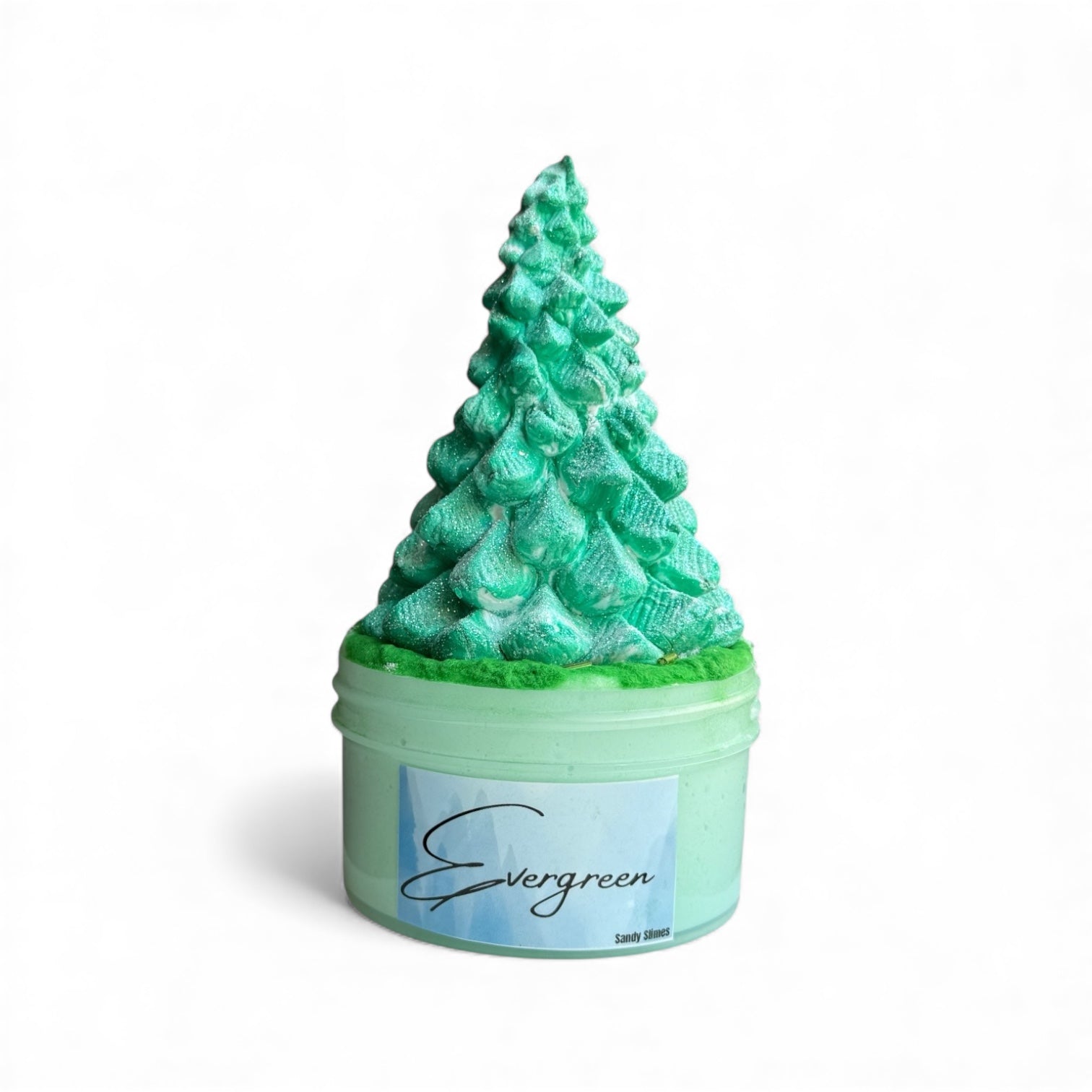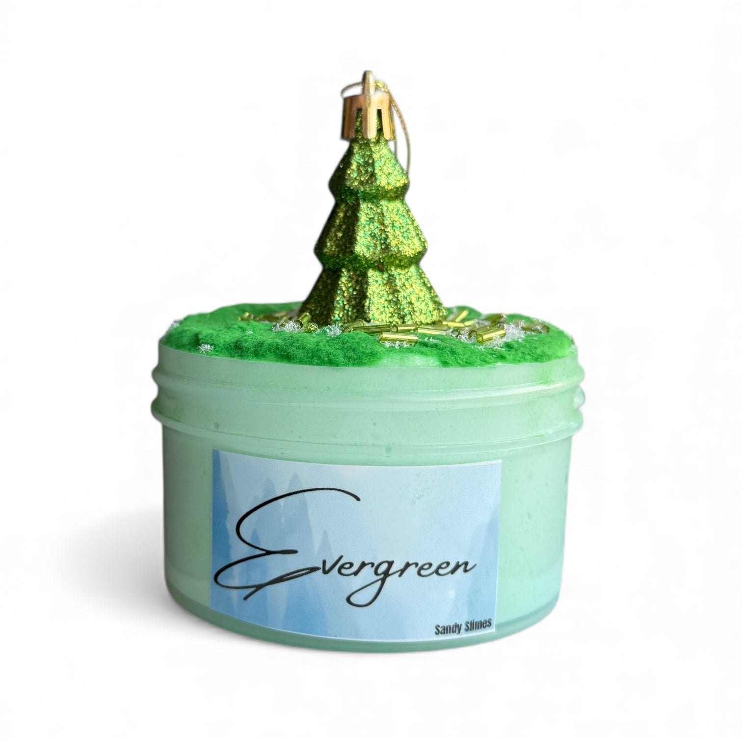This is a white glue jelly with a slightly larger snow content than our cheesecake slimes. It comes with flocking powder, fake snow, and stick beads to sit on the top. The DIY Clay piece is quite elaborate and made of a J-Clay blend swirl of spruce and white to give the tree a snow kissed look. It will also be dusted with glitter to look like snow. Once the clay is mixed, it will turn the slime into a rich snow butter. The charm will be a glitter tree ornament that will come with both options.