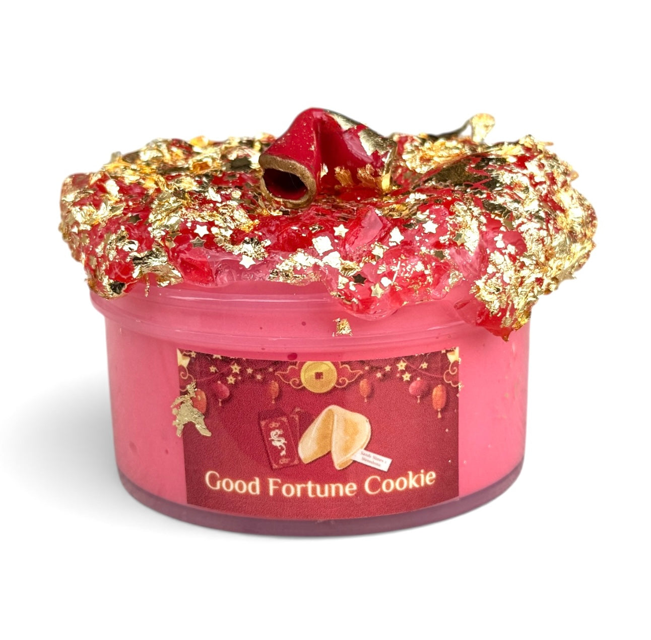 Good Fortune is a fluffy slay. This is the first time having this texture in our shop. It features two clays and three glues. It also has some extra goodness to make it inflate easily. It is topped with a clear 2 oz red silica topper, gold foil, and gold star sequins. Just a warning, the gold foil will stick to the charm, so you may want to add it away from where the charm will rest. The slime is scented candied fruits and butter sugar cookie.