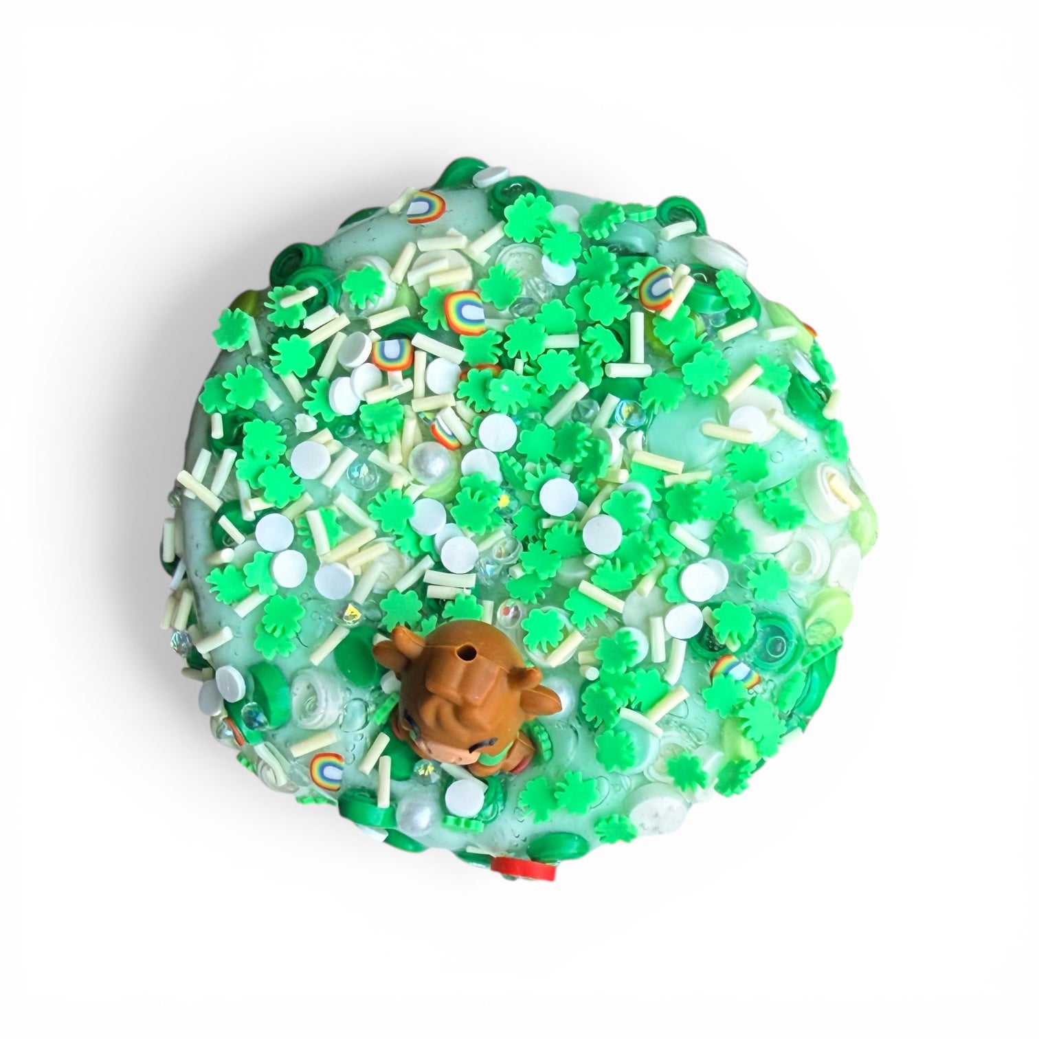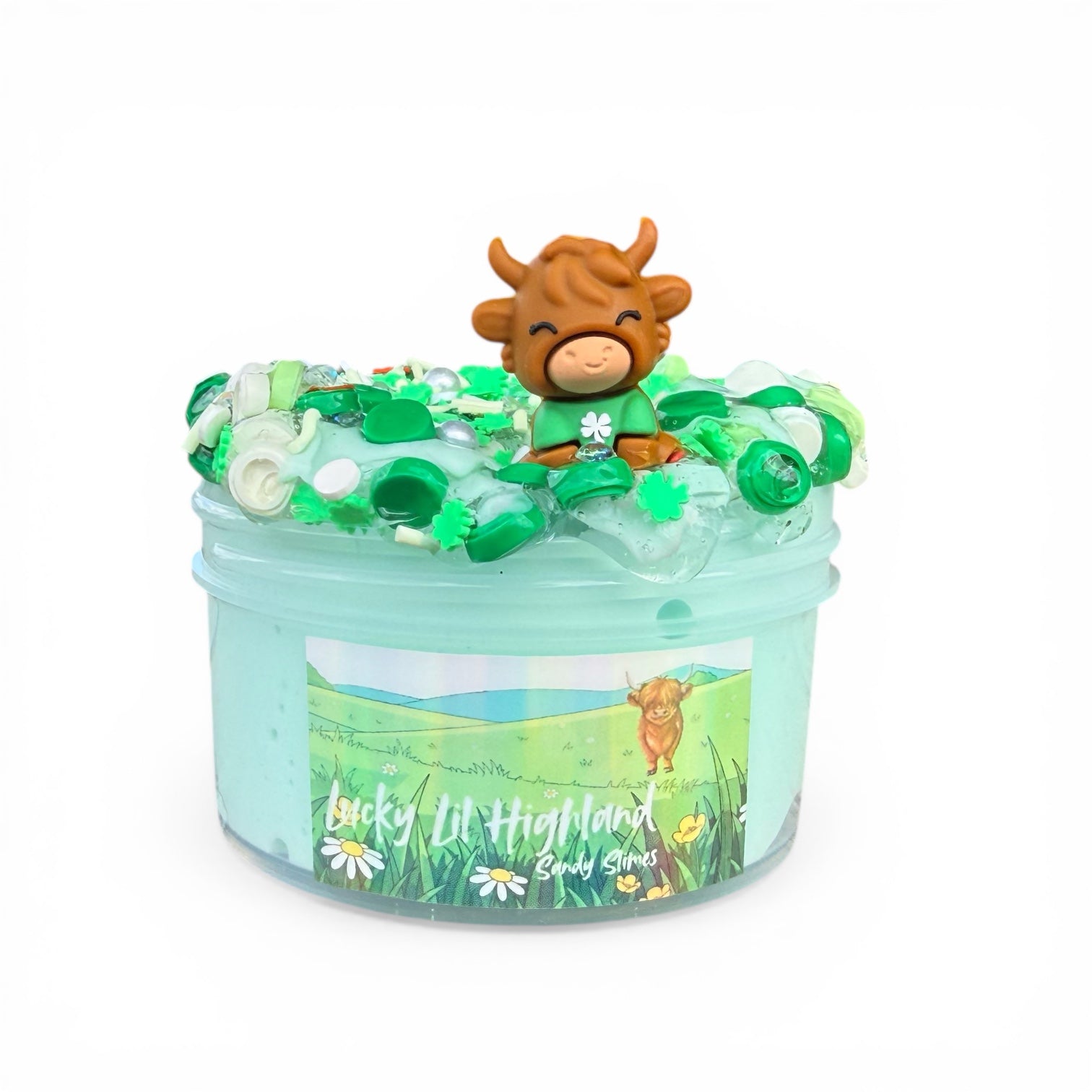 Lucky Lil Highland is a is our signature thick and glossy in a light green color. It features a button bead topper in various shades of green and white. You will also receive an adorable shamrock and rainbow fimo mix to put on the top. The charm will the sweetest little rubberized highland cow.