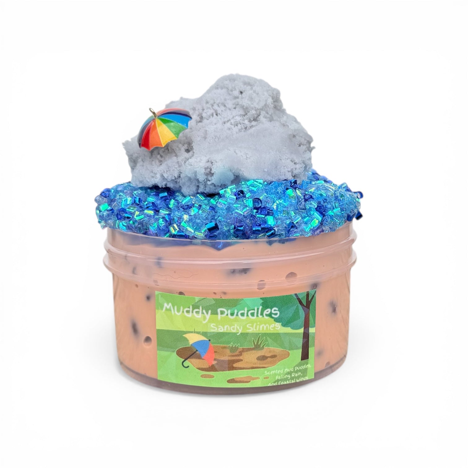 We are bringing back a spring rainstorm in our slime Muddy Puddles. This slime is a featuring three layers that compliment and combine into one amazing texture. The base is our signature thick and glossy slime scented like mud puddles. We went a little lighter on the colors this year to allow the end color to be more visually appealing. (1st photo - 6 oz) It has non abrasive pebble beads for added texture. The crispy blue bingsu is supposed to mimic the look of falling rain. The topper is a light gray, fluffy cloud to imitate a storm cloud. Enjoy each layer on its own, and then combine them for a brand new texture. It is gentle on the most sensitive of hands.