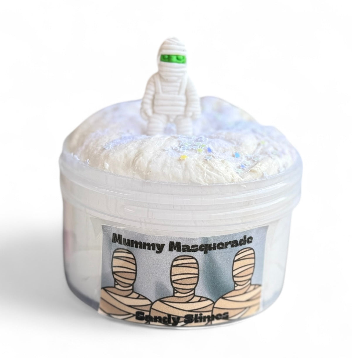 Mummy Masquerade is a new texture to the shop. This is our first Japanese paper clay snowbutter. While it doesn’t feel pulpy, it has pulp and paper within the clay giving it a more dense feel and a smooth stretch. It is a highly moisturized texture, so it’s great for dry hands. You’ll receive flocking powder for the top which is meant to give it a more mummy feel and some micro star sequins. The charm is an adorable mummy eraser. This is scented blackberry bourbon. The scent blend has notes of fresh blackberries, vanilla, a small dash of grape, and sweet bourbon. It’s one of my most favorite blackberry blends ever.