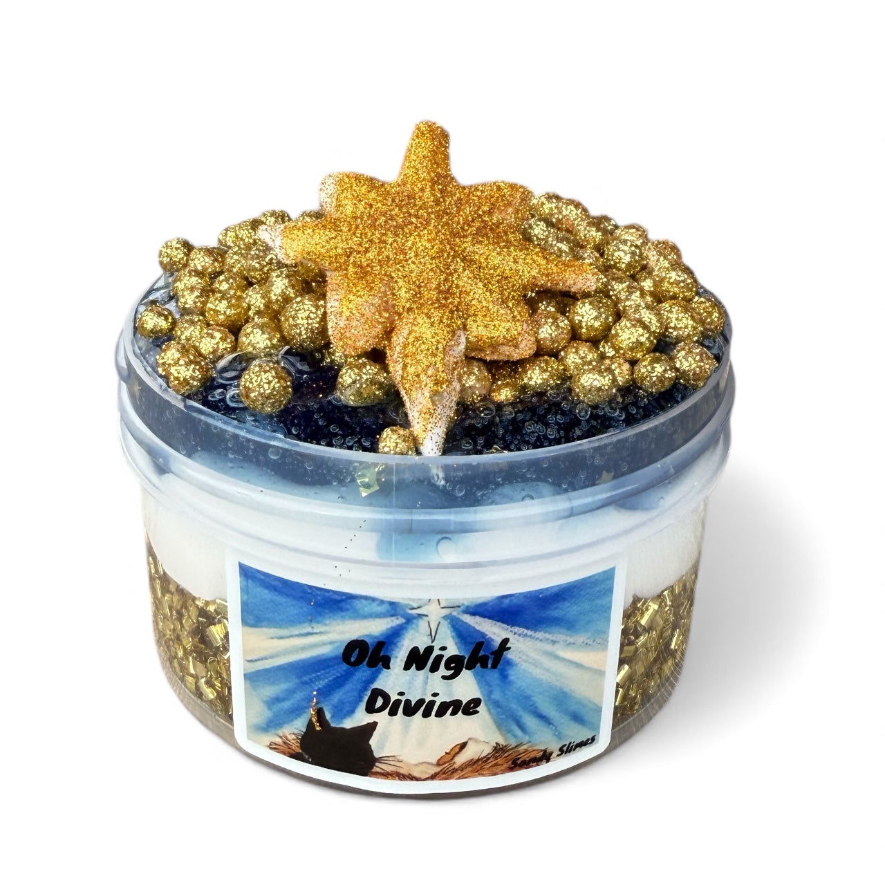 Oh Night Divine is a multi layered slime. It combines a layer of gold metallic bingsu, a layer of glow in the dark butter, a layer of pigmented clear with star glitter to look like the night sky, and topper with gold glitter floam and DIY glitter star clay piece.