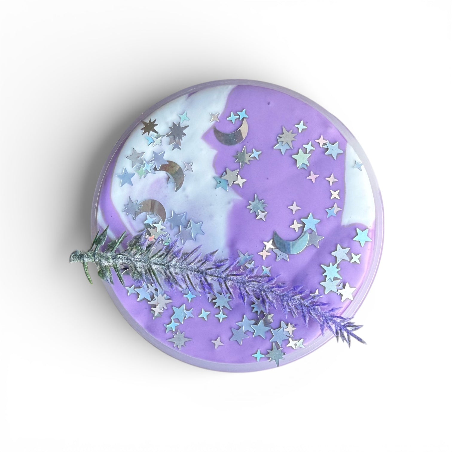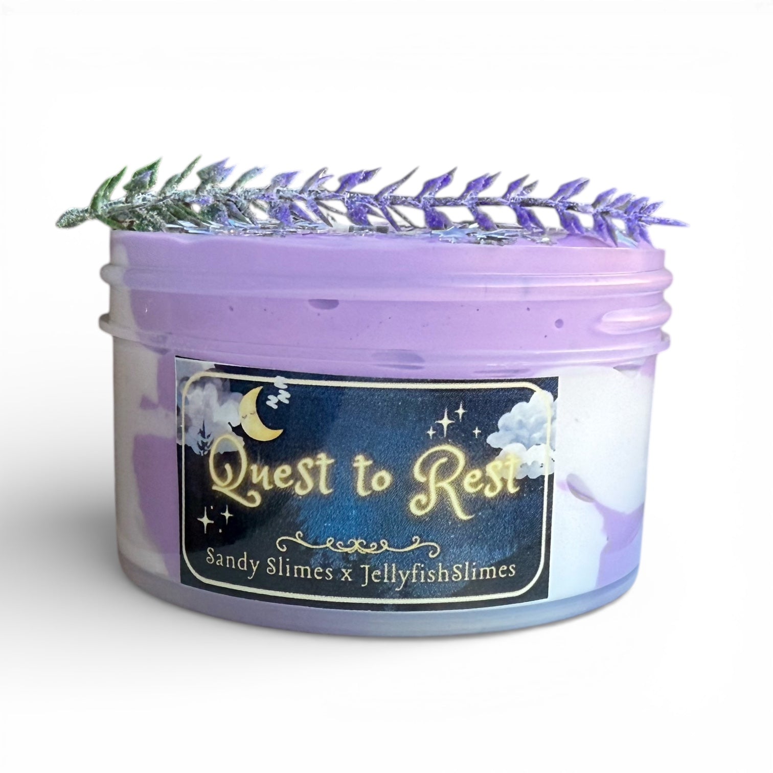 This slime is a brand new texture to the shop. It is a Brazilian Clay Aromatherapy Butter Swirl. It is infused with cosmetic grade Brazilian Clay known for its soothing components and gentleness on sensitive skin. It has dual colors to complement the clouds on the label. The purple portion is scented a true French lavender and is infused with lavender essential oil. The white swirl is scented a blend of lavender and honey. It’s sweeter and cuts the intensity of the lavender. It comes with a star and moon sequin mix in a contrasting silver. You’ll receive a sprag of lavender to act as the charm. This slime makes a wonderful nightstand slime promoting relaxation and sleep.