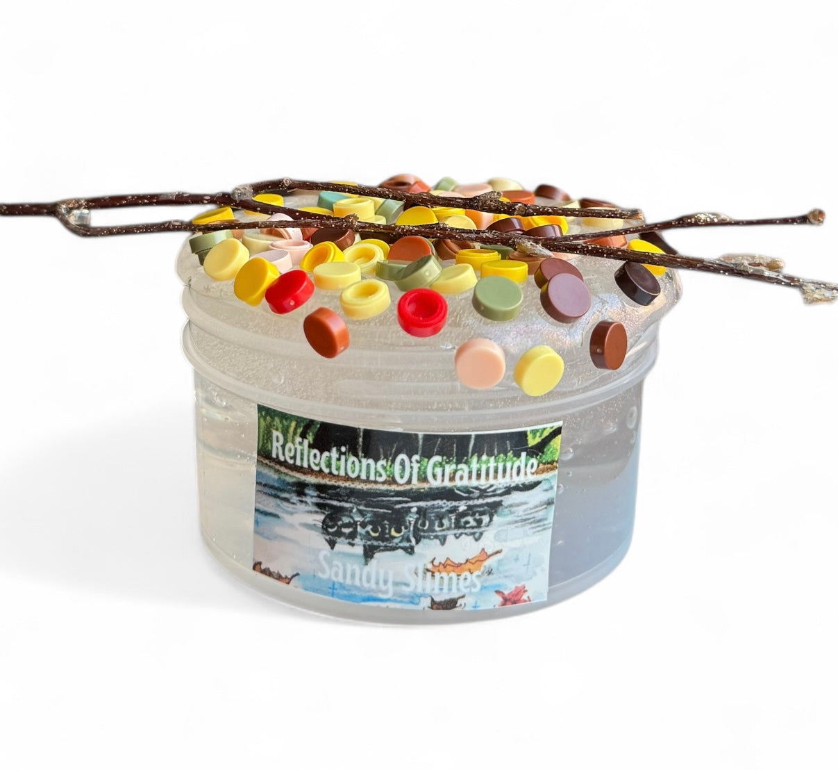 Reflections of Gratitude is a lightly pigmented holographic clear slime with an autumnal mix of button beads for the top. It is scented Vanilla Cashmere Cream, Caramel Woods and Frosted Clementine. It’s a lightly sweet and comforting scent blend.