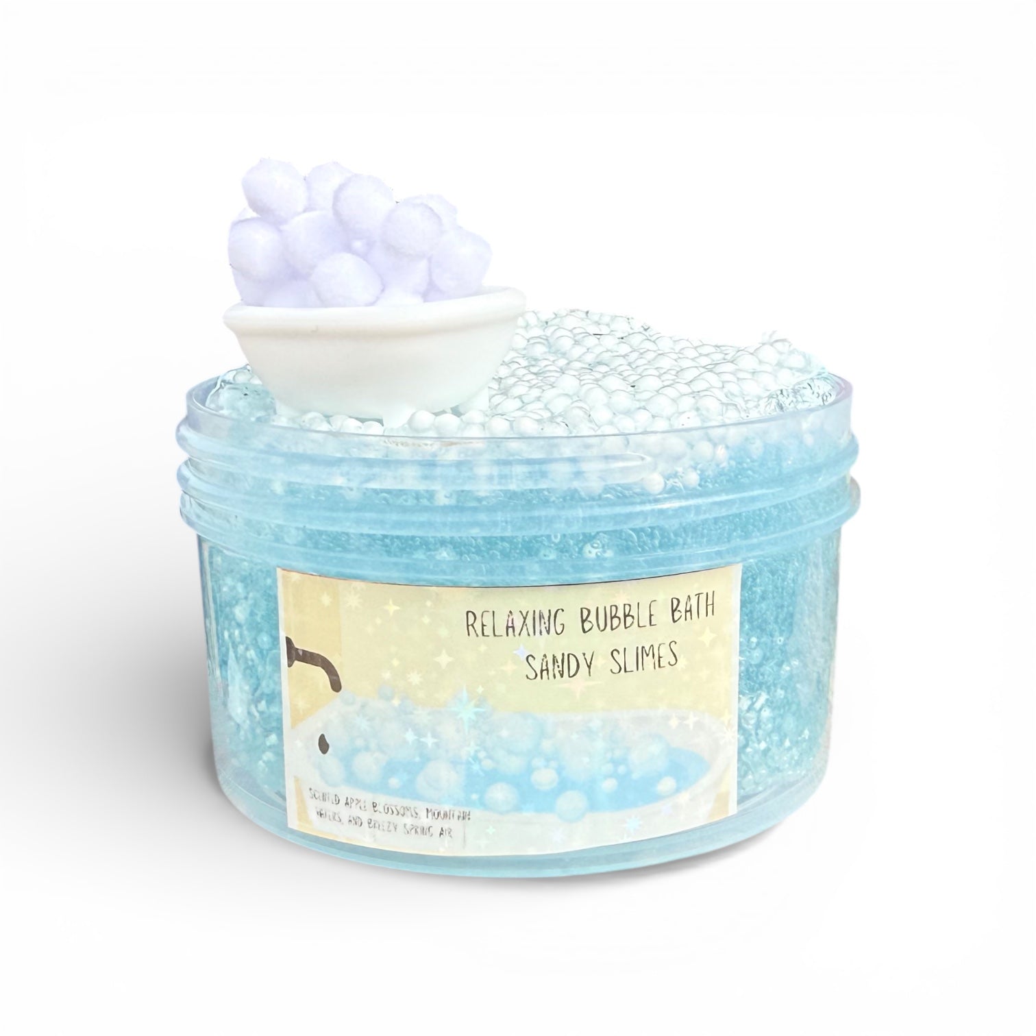 Relaxing Bubble Bath is a coated clear, semi crunchy slime with micro seed beads and microfloam for a bubble filled bathtub look.
