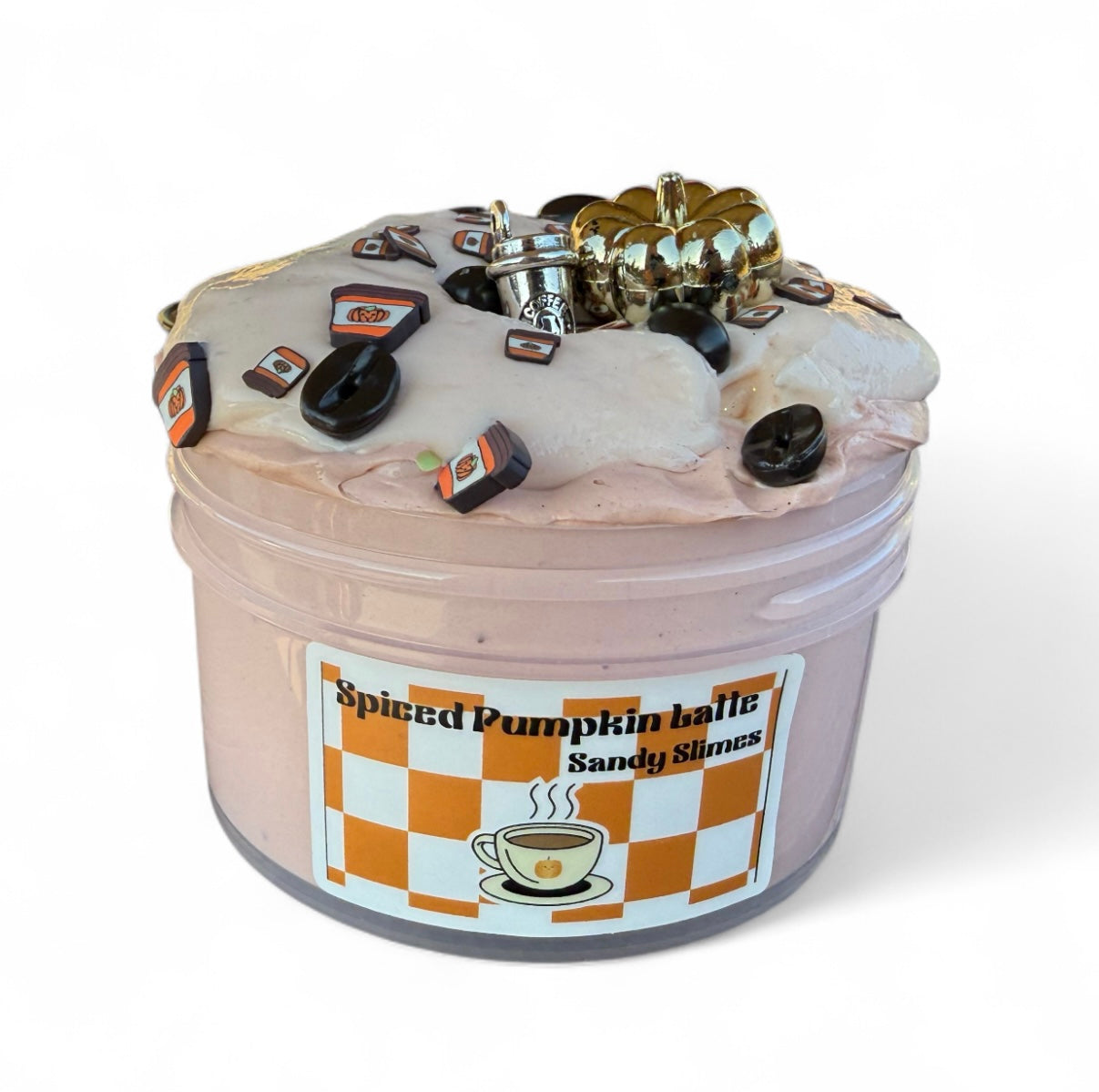 Our glue all snow butter is back. Spiced Pumpkin Latte is a thick and creamy snow butter. It comes with a pumpkin cold foam topper that we first introduced this texture with our pumpkin chai latte slime a few restocks ago. It had hand blended pumpkin spice latte. The coffee smell is a little more muted then Morning Coffee Run, with notes of the milk & punpkin equally prominent. It is topped with a cute psl fimo mix and a stainless coffee cup necklace charm and a golden pumpkin.