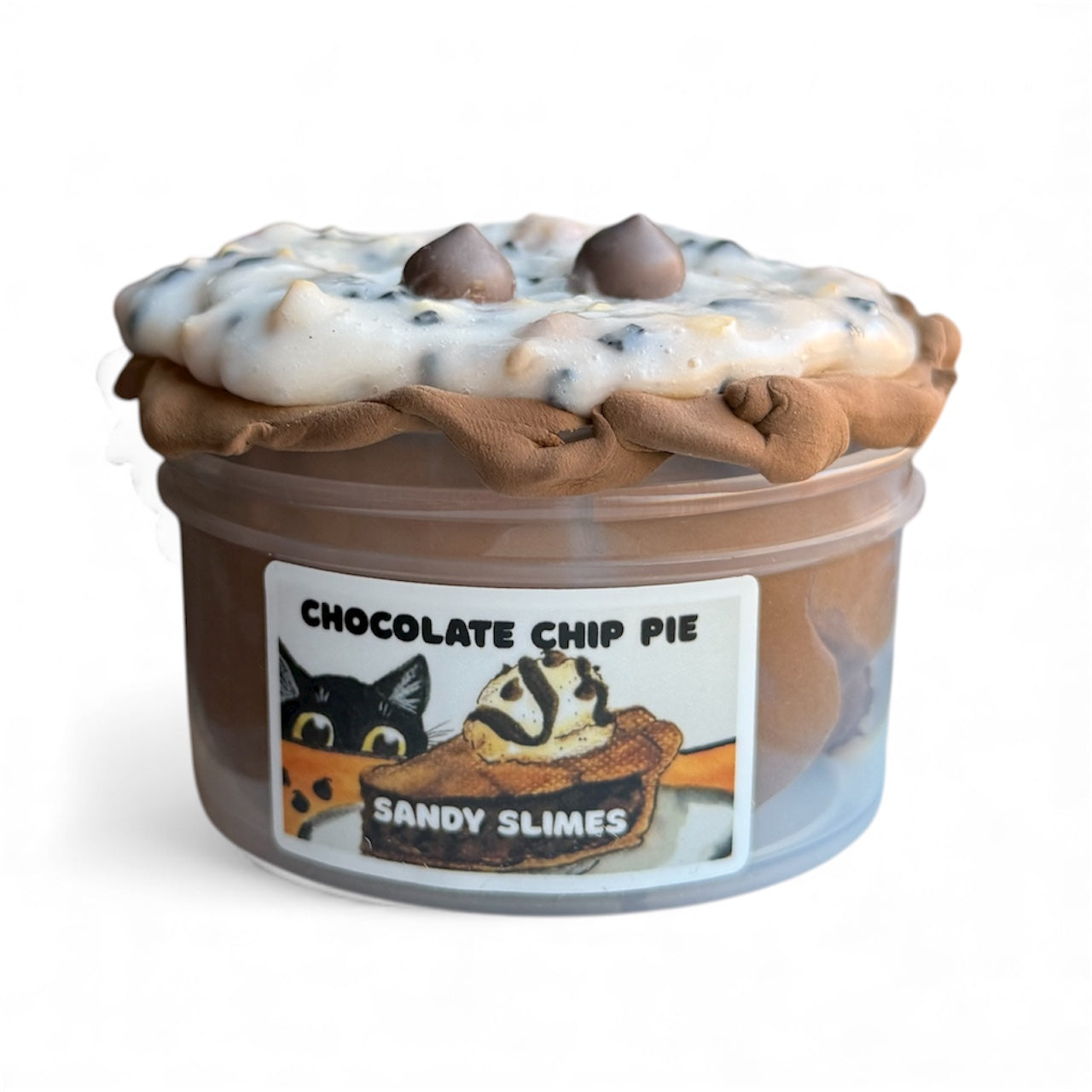 Chocolate Chip Pie is a version of a pie I make every year at Thanksgiving. It features a milky clear base loaded with faux nuts, oats, and chocolate crumb pieces. You’ll receive a nice portion of tan clay to act as the pie crust. This mixes into a creamy butter slime loaded with tons of grit and texture. It’s scented hand blend chocolate chip pie.