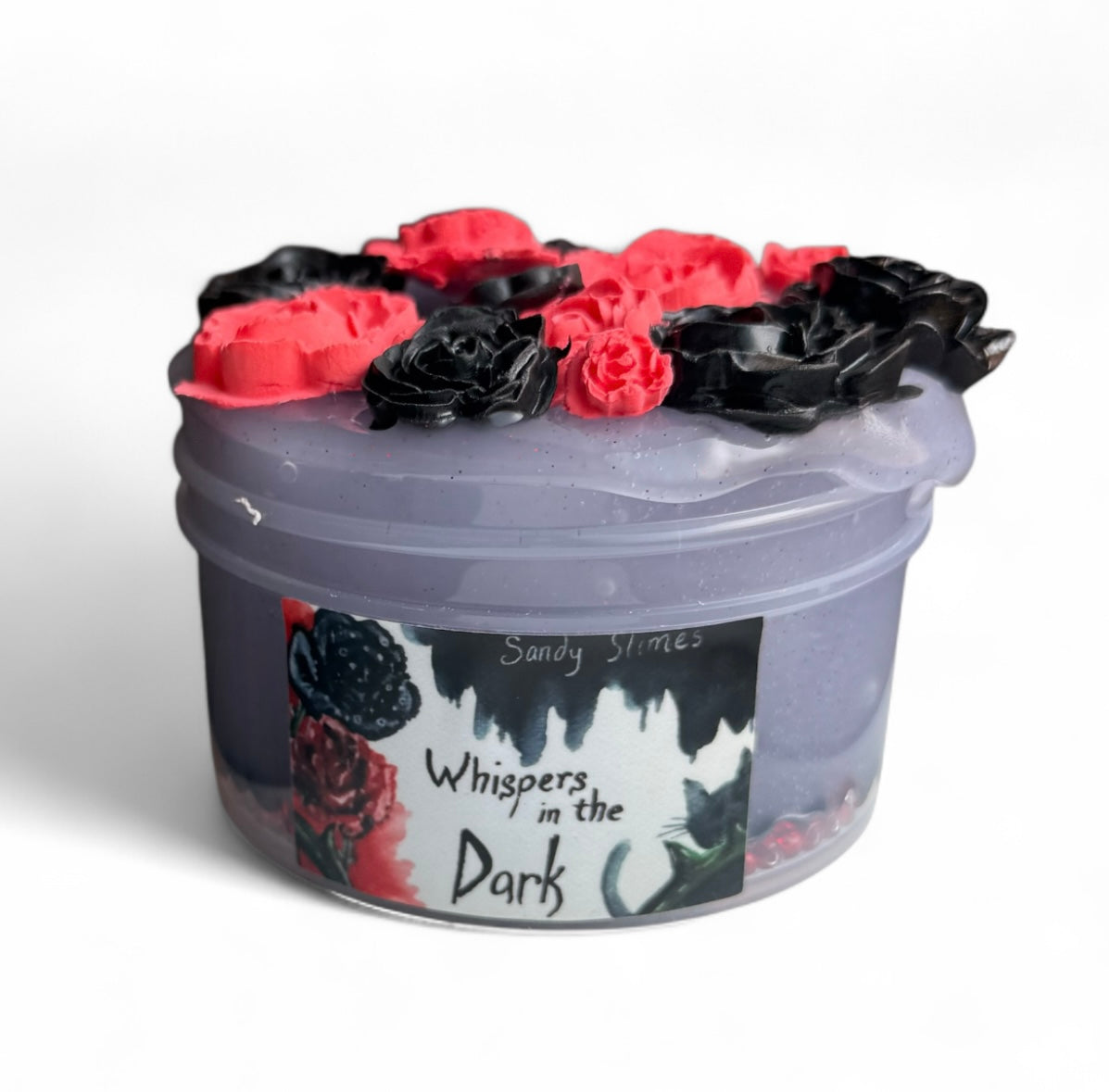 Whispers in the Dark a coated milky clear slime topped with a seed bead crust, featuring dainty little clay roses. We’ll make sure to seal the container in plastic wrap so it stays perfectly fresh. The roses mix into the slime effortlessly, creating a creamy texture that still delivers those all the pops and crackles. One of the roses is actually a charm. Can you spot which one?